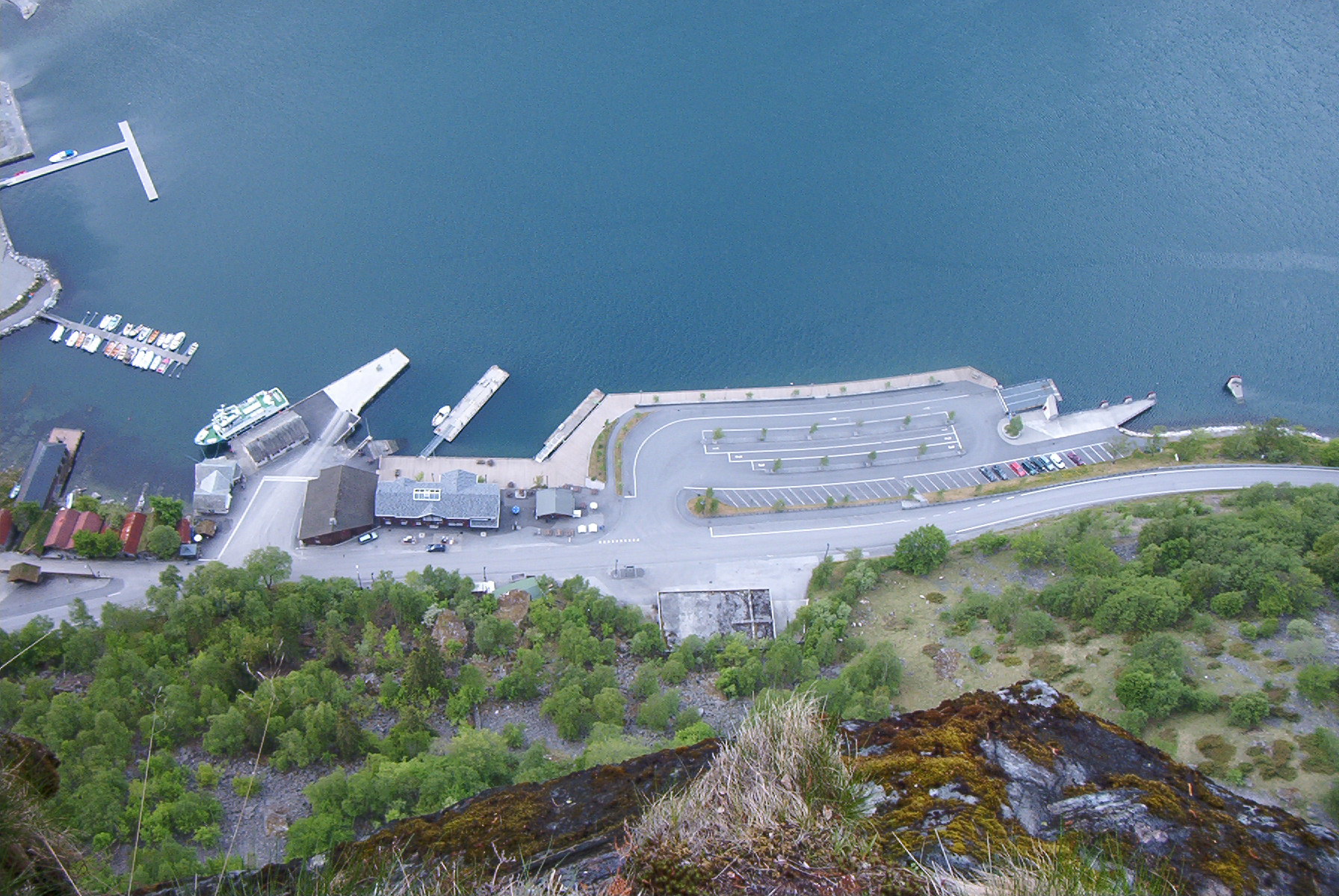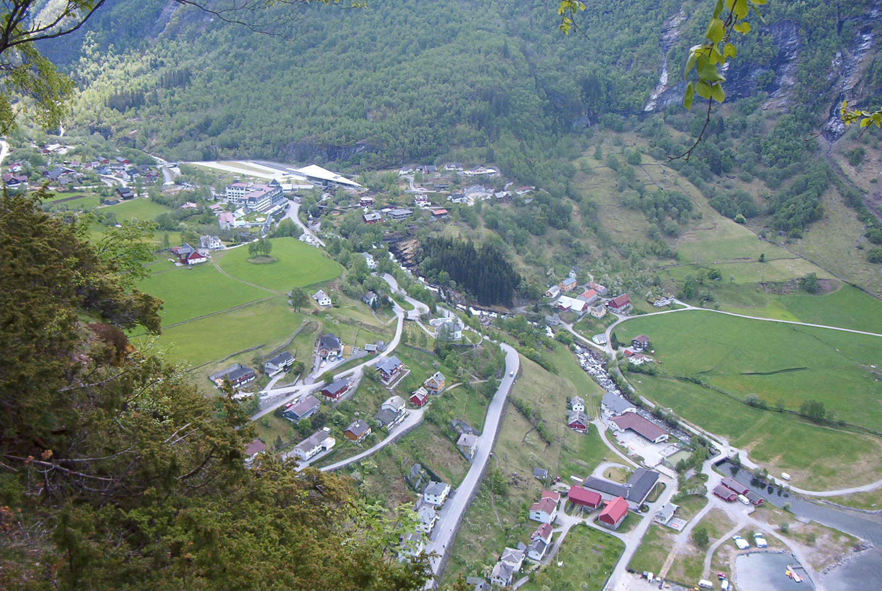 Der får du ein fantastisk utsikt over sentrum i Geiranger og fjorden.